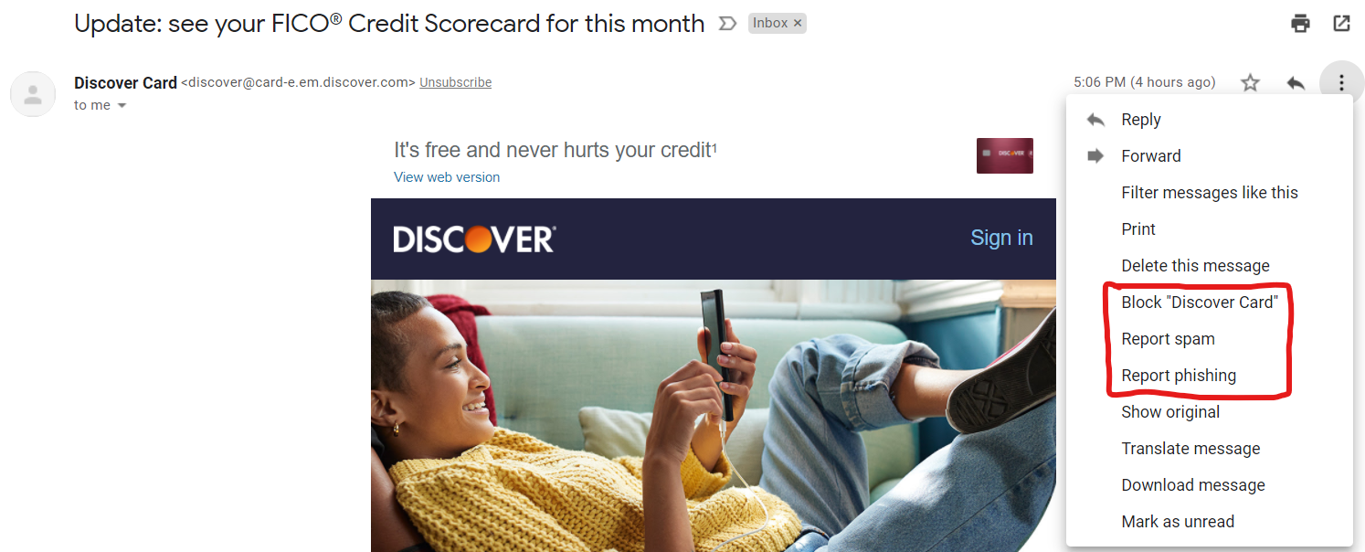 While I tried to cover this above, it bears repeating. Don’t take any action on anything that seems suspicious! Don’t click on hyperlinks, don’t download attachments, and don’t give out any information over the phone. If there is a way to report suspicious emails, like Gmail’s built-in functionality when you click the three dots, then report-and-block the sender is a great policy.